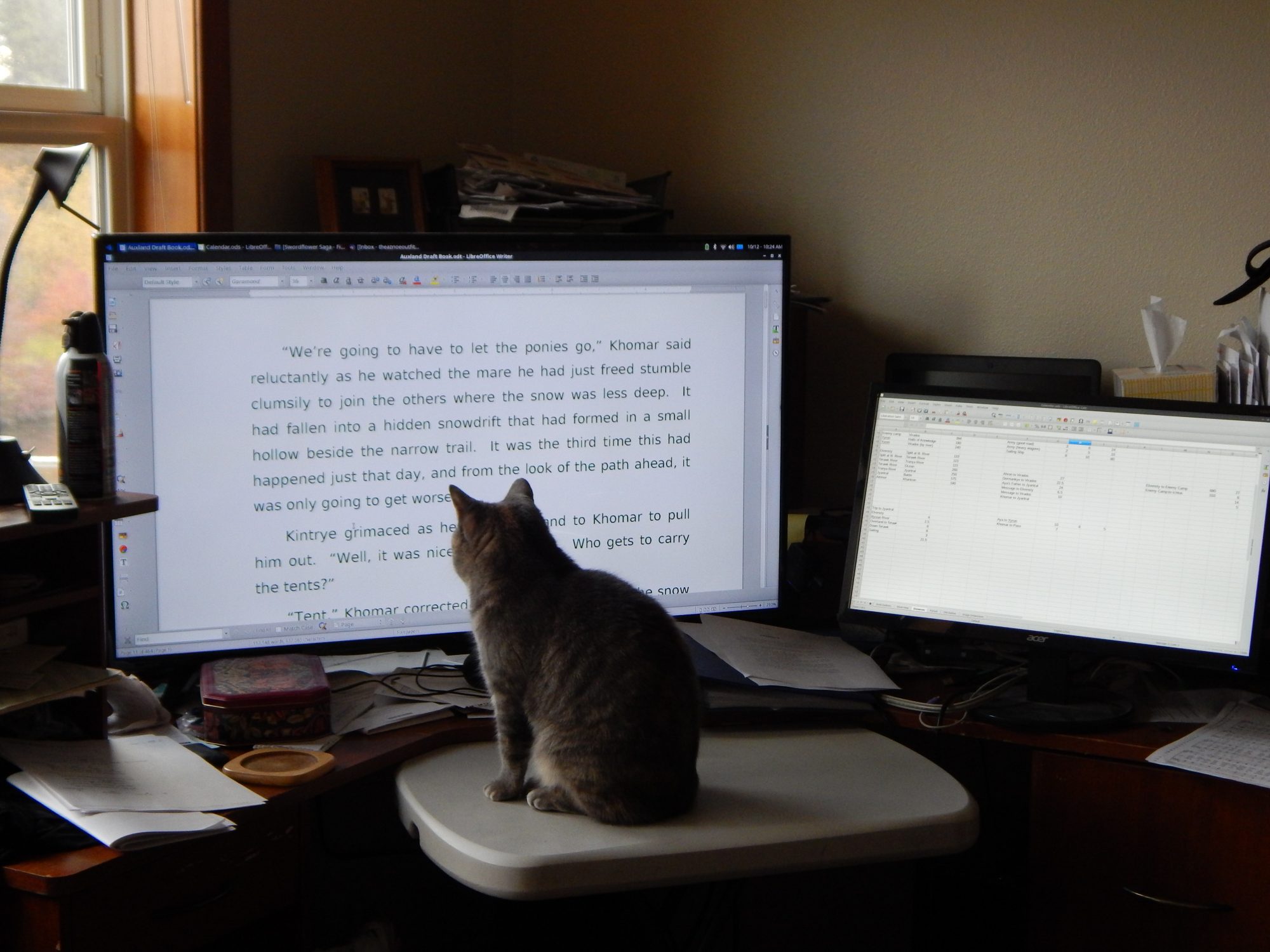 One of the first questions we are asked when we say that we write together as a couple is “How do you do it?” The simple answer is: together! Here is a picture of our computer setup (complete with our feline critic).