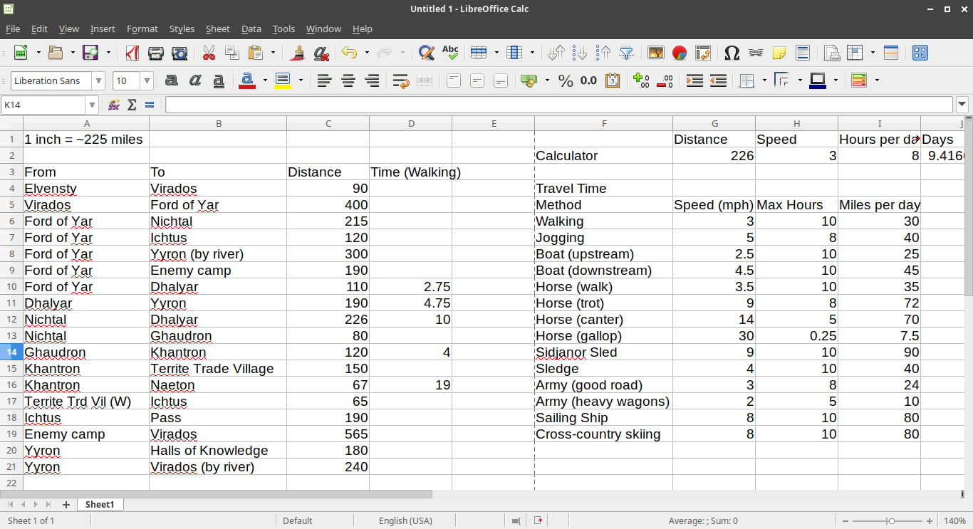 Probably our most used spreadsheet though is the distance and time sheet. M. found how long each method of transportation takes, how far each city is from one another, and made a calculator so we can plug in distance, method of transport, how many hours traveled per day, and find out how many days it would take to get from place to place.