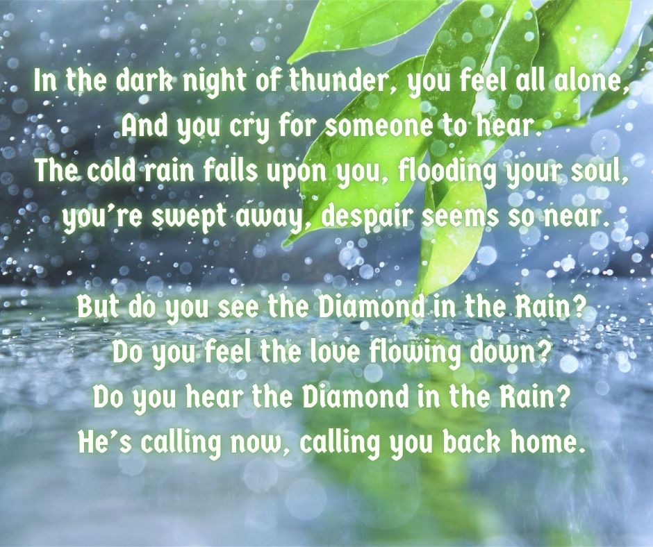 In closing, I’d like to share a song that we included in our prologue. I hope it encourages you to seek the Diamond in the rain, the hope of Jesus who is calling for His children to come home. This song was actually recorded by M. years ago when he was in his first band (before I had even met him!). To hear the full song, click here.